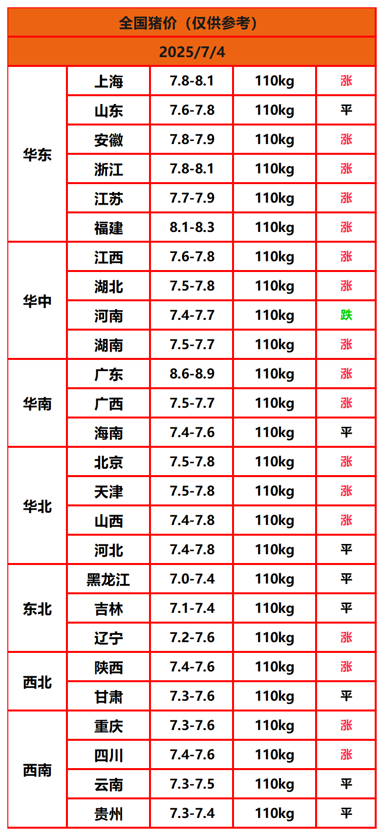 2025年7月4日猪价,今日全国猪价行情走势:17涨8平1跌。