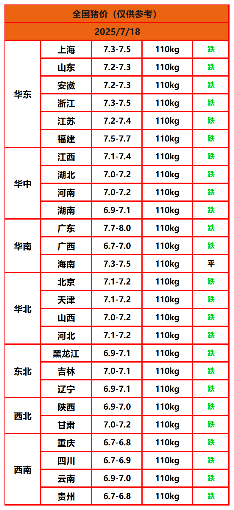 2025年7月18日猪价,今日全国猪价行情走势:0涨1平25跌。
