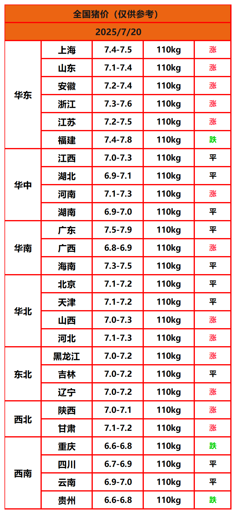 2025年7月20日猪价,今日全国猪价行情走势:13 涨10 平3跌。