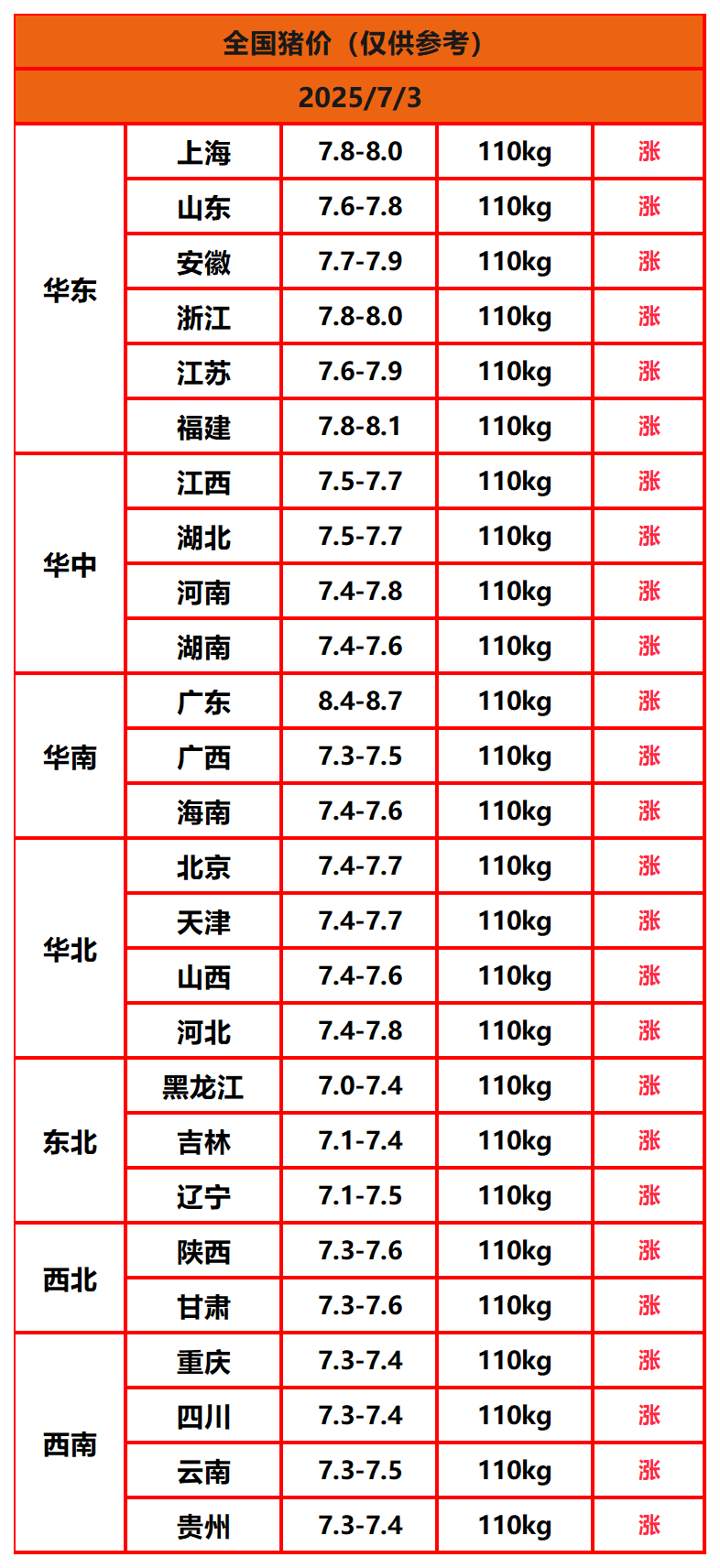 2025年7月3日猪价,今日全国猪价行情走势:26涨0平0跌。