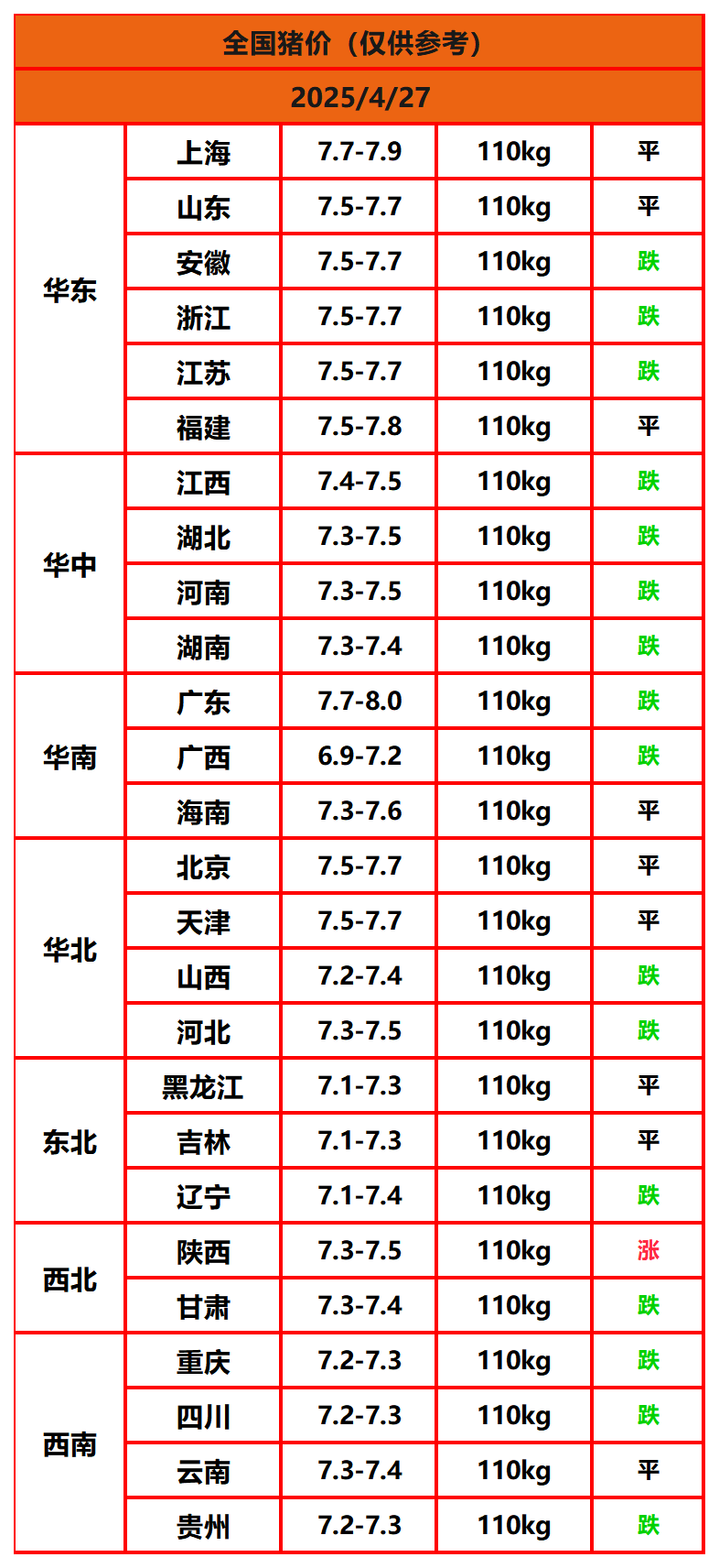 2025年4月27日猪价,今日全国猪价行情走势:1涨9平16跌。