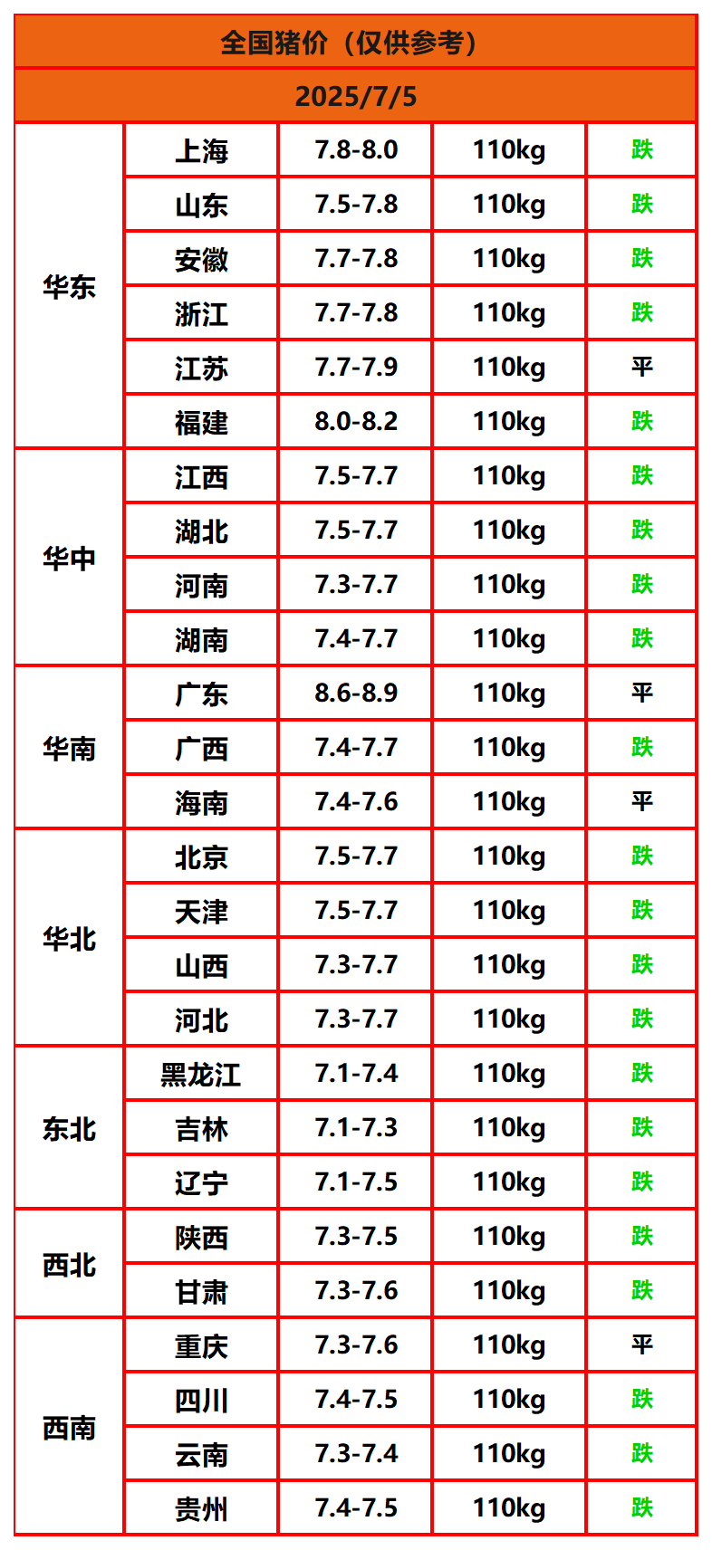 2025年7月5日猪价,今日全国猪价行情走势:0涨4平22跌。